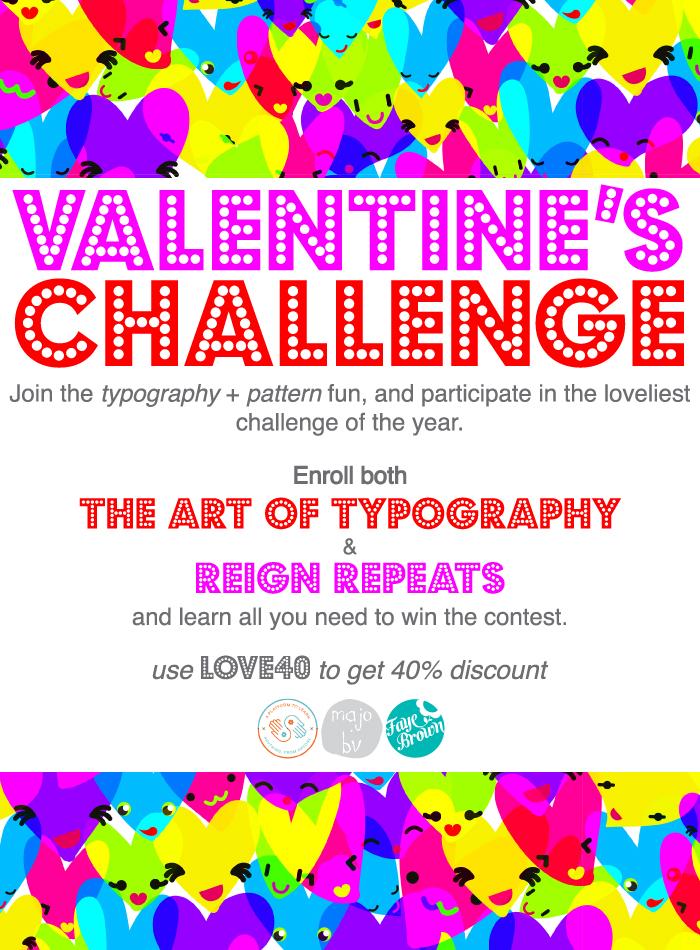 1. Submit your final project to both classrooms (or just one), but remember you have to be signed up to both courses to win! - use code LOVE40 to get 40% off when you enroll Reign Repeats and The Art of Typography.